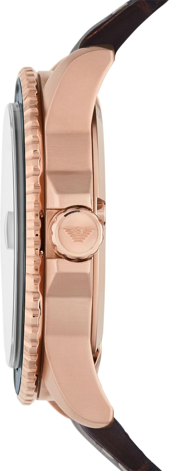 Emporio Armani's 42mm watch features a blue sunray dial, three-hand date movement and brown croco embossed leather strap.