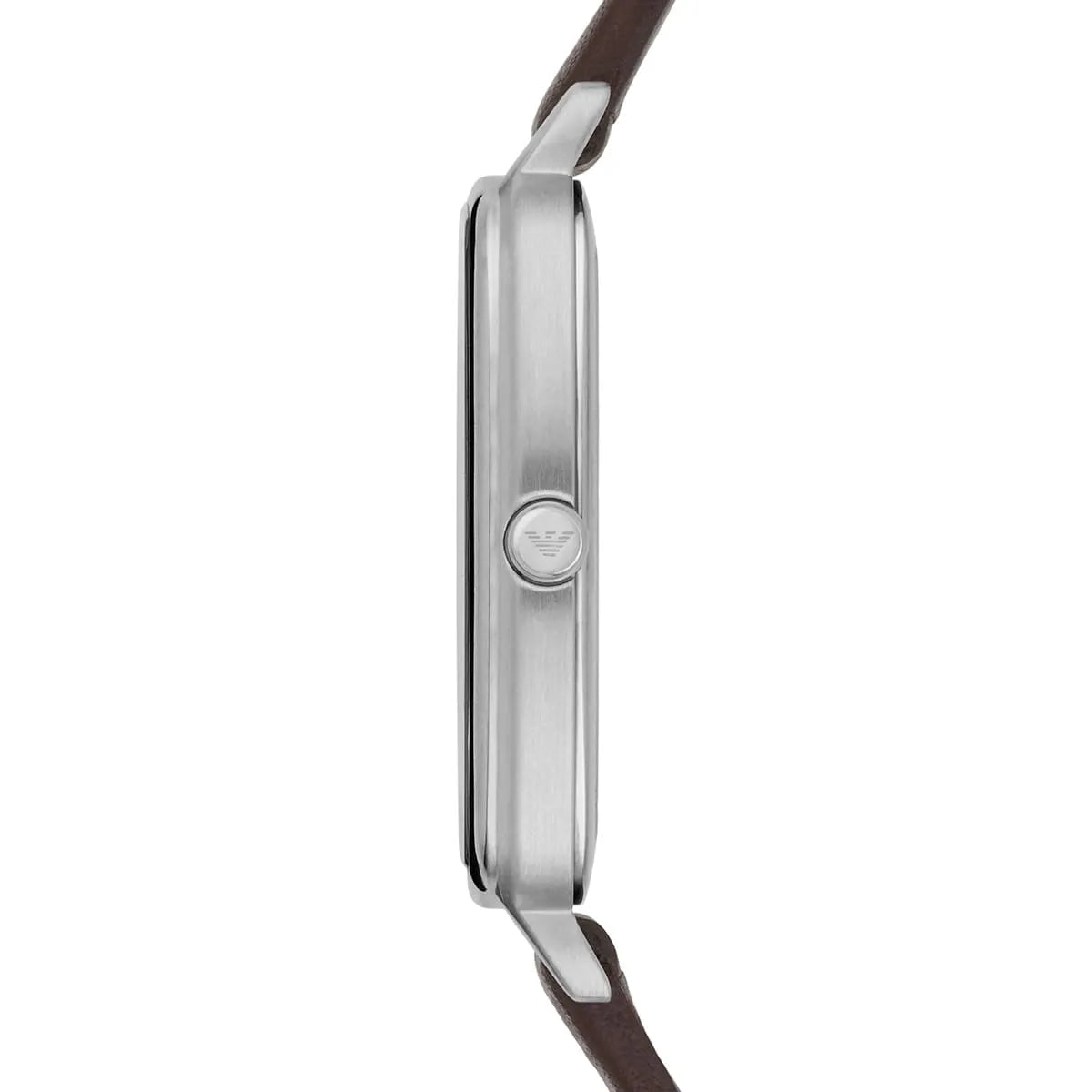 Stainless steel case with a brown leather strap. Fixed stainless steel bezel. Blue sunray dial with silver-tone hands and index hour markers. Arabic numerals mark the 3, 6 and 9 o'clock positions. Minute markers around the outer rim. The Emporio Armani logo appears at the 12 o'clock position. Dial Type: Analog.