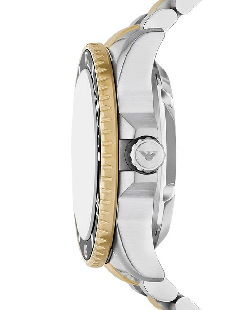 The Emporio Armani Sea Explorer AR60089 is a striking timepiece with a bold round face and a contrasting bezel that draws attention. The watch features a 42 mm diameter, making a strong statement on the wrist. Its black dial is adorned with prominent hour markers and hands, offering clear readability. The case, in a captivating gold hue, pairs seamlessly with the dual-tone bracelet, which combines gold and silver links for a unique look. The bracelet's alternating links add visual interest and character, while the fold-over clasp ensures a secure fit.