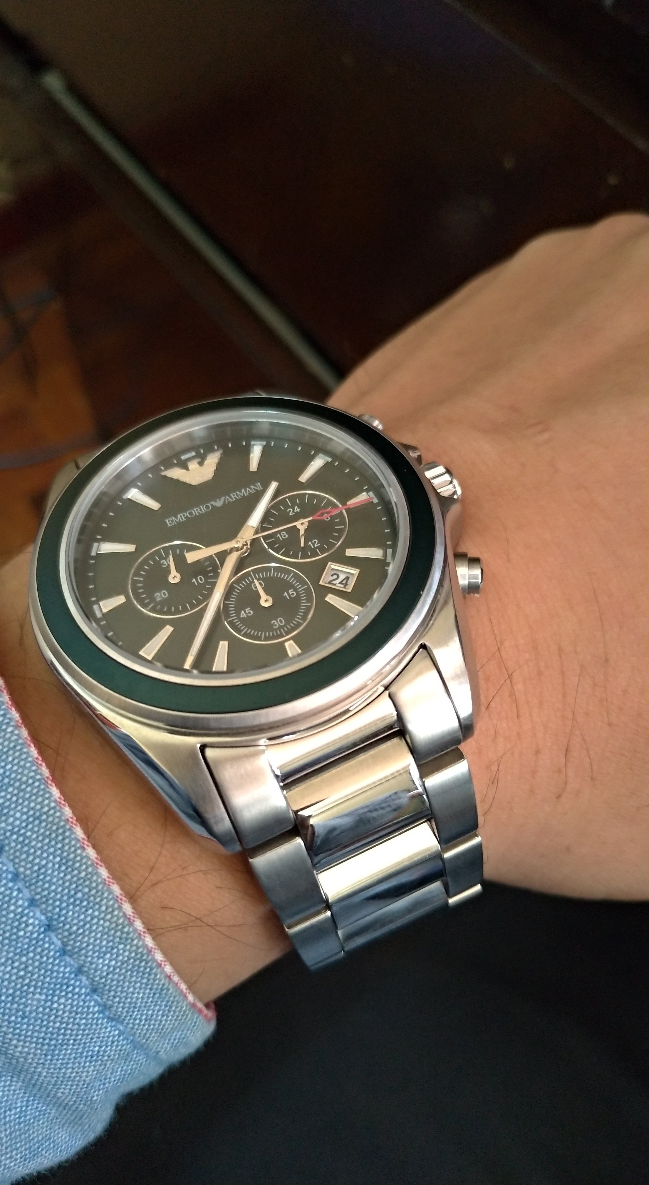 Silver-tone stainless steel case with an emerald green dial and silver stainless steel bracelet. This watch is shipped with its original box and official warranty.