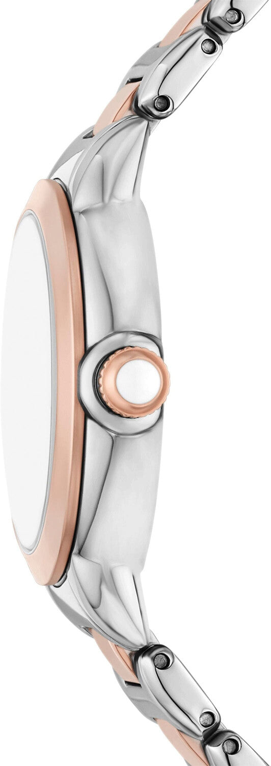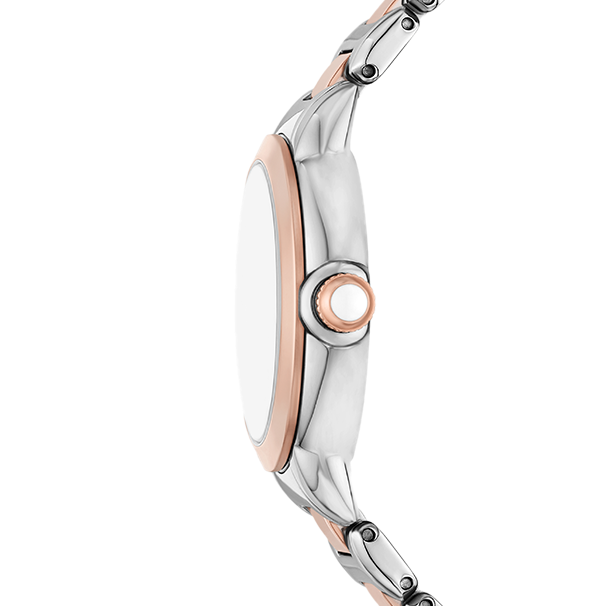 Emporio Armani's 32mm Mia watch features a silver sunray dial with crystal stones, three-hand movement and two-tone stainless steel bracelet. If you are looking for a refined look. Known for its distinctive pattern, this timepiece stands out. With a stunning design and charming looks, this is an exquisite wristwatch made for Every one.