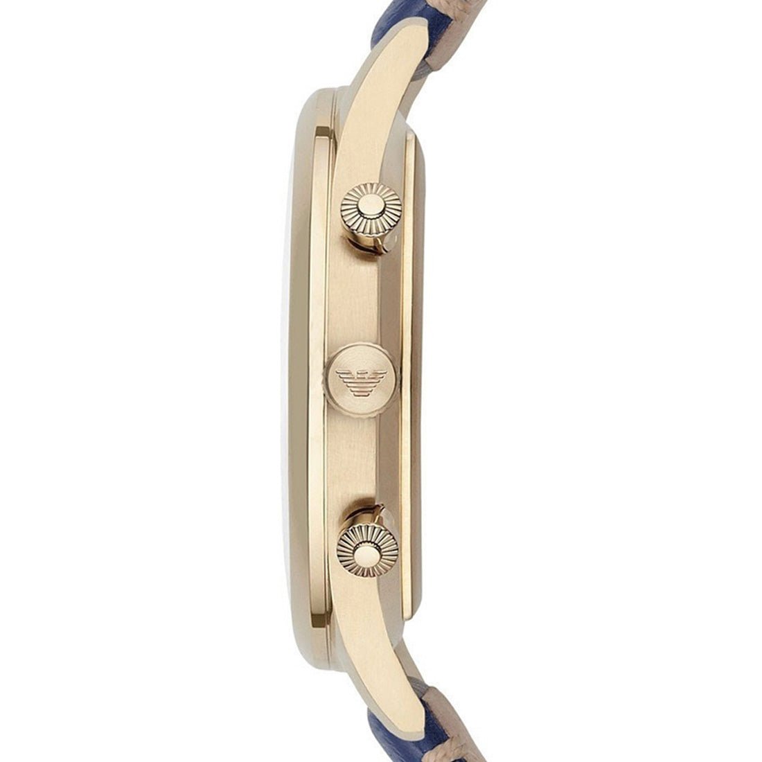 Gold-plated stainless steel case with a blue leather strap. Fixed gold-plated bezel. Blue dial with gold-tone hands and alternating Arabic numeral and index hour markers. Minute markers around the outer rim. The Emporio Armani Eagle appears at the 12 o'clock position. Dial Type: Analog. Date display between the 4 and 5 o'clock positions. Chronograph - three sub-dials displaying: 60 seconds, 60 minutes, and 24 hours. Quartz movement. Scratch-resistant mineral crystal. Pull/push crown. Solid case back. Case diameter: 43 mm. Case thickness: 12 mm. Round case shape. Strap width: 22 mm. Tang clasp. Water-resistant at 50 meters / 165 feet. Functions: date, hour, minute, second. Casual watch style. Emporio Armani Chronograph Blue Dial Blue Leather Men's Watch AR1862.