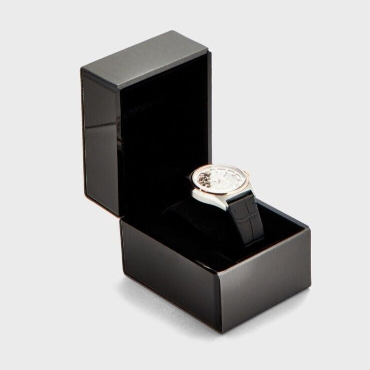 Stainless steel case with a black leather strap. Fixed rose gold-tone bezel. White (skeleton center) dial with luminous rose gold-tone hands and index hour markers. Minute markers around the outer rim. The Emporio Armani Eagle appears at the 12 o'clock position. Dial Type: Analog. Luminescent hands and markers.