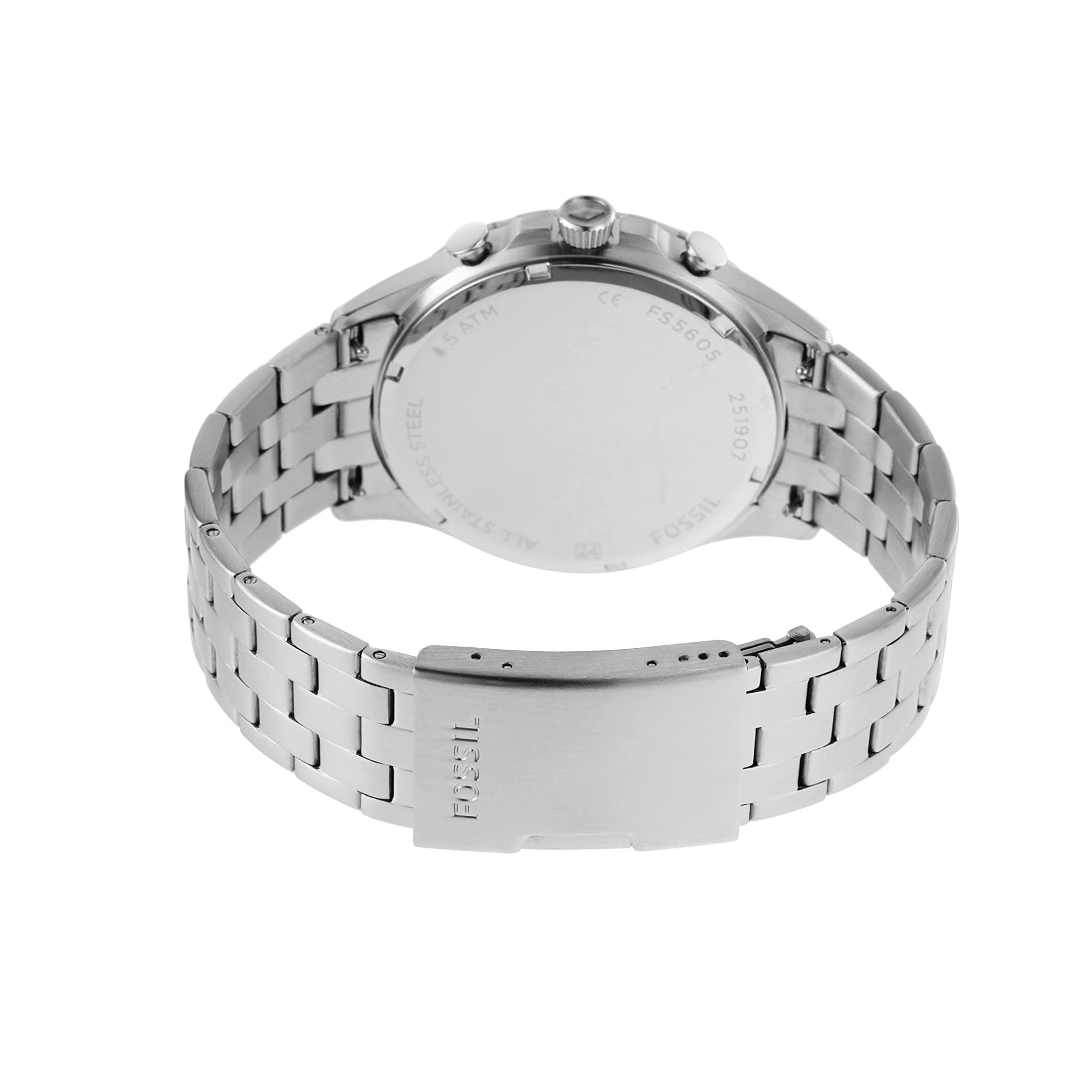 Chronograph - three sub-dials displaying: 60 second, 30 minute and 24 hour. Quartz movement. Scratch resistant mineral crystal. Solid case back. Round case shape. Case size: 46 mm. Case thickness: 11 mm. Band width: 24 mm. Fold over clasp with a push button release. Water resistant at 50 meters / 165 feet. Functions: chronograph, date, hour, minute, second. Forrester Series. Watch label: Japan Movt. Fossil Forrester Chronograph Quartz Blue Dial Men's Watch FS5605.