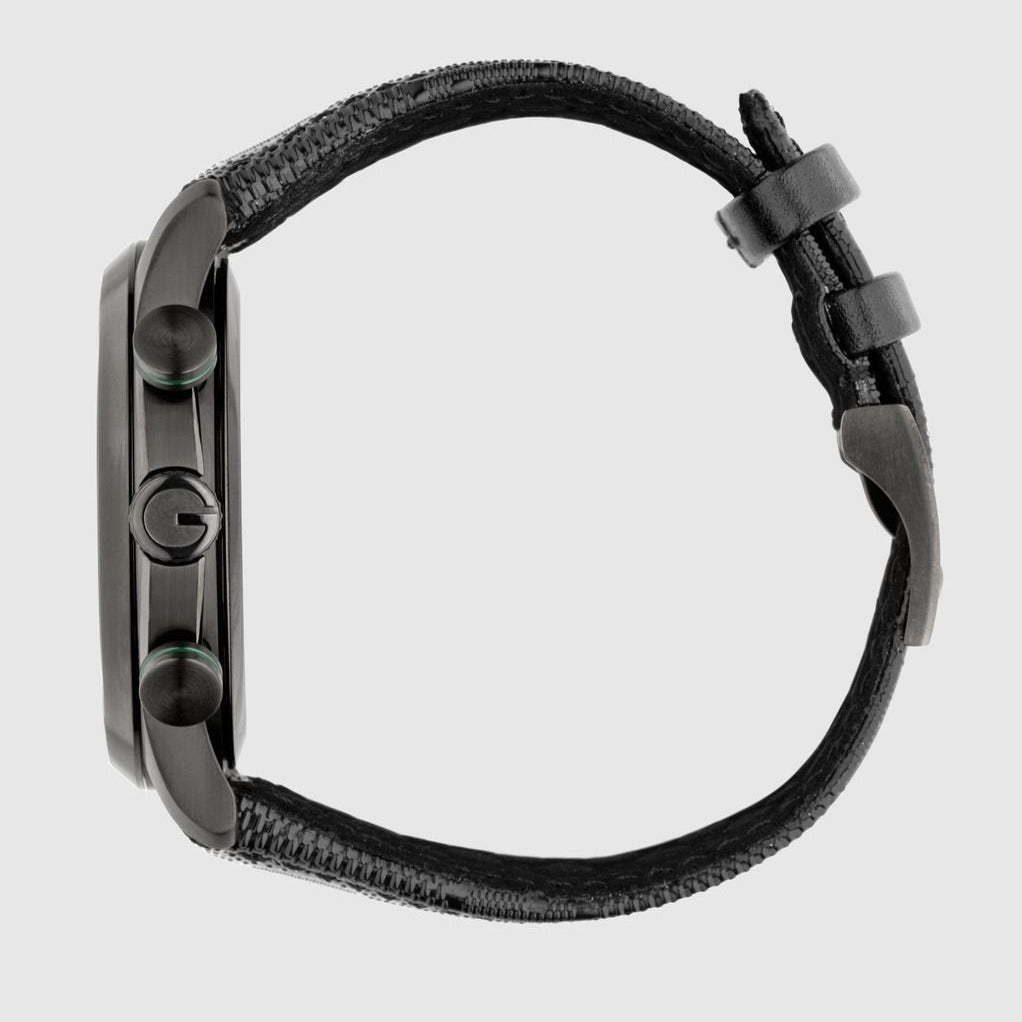 Black PVD stainless steel case with a black (GG logo) fabric strap. Fixed black PVD bezel. Black dial with luminous black hands and index hour markers. Arabic numerals mark the 6, 9 and 12 o;clock positions. Minute markers.Brand: Gucci