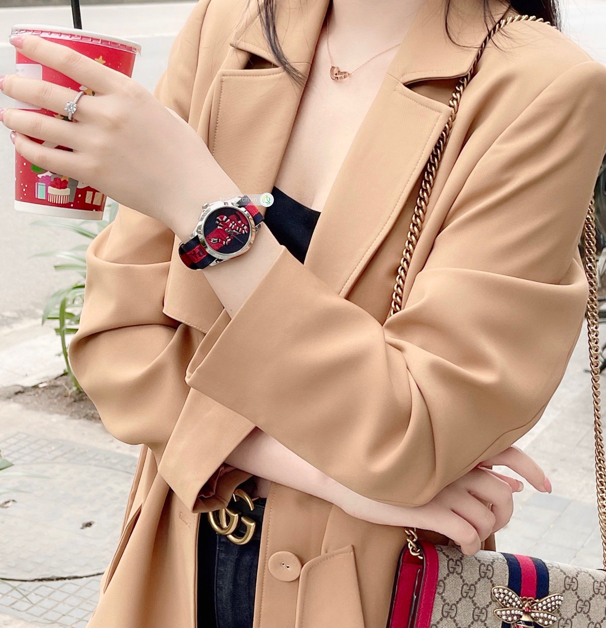 Lady watch with quartz movement, 38 mm stainless steel case on nylon strap, blue and red dial, water resistance 50 meters.