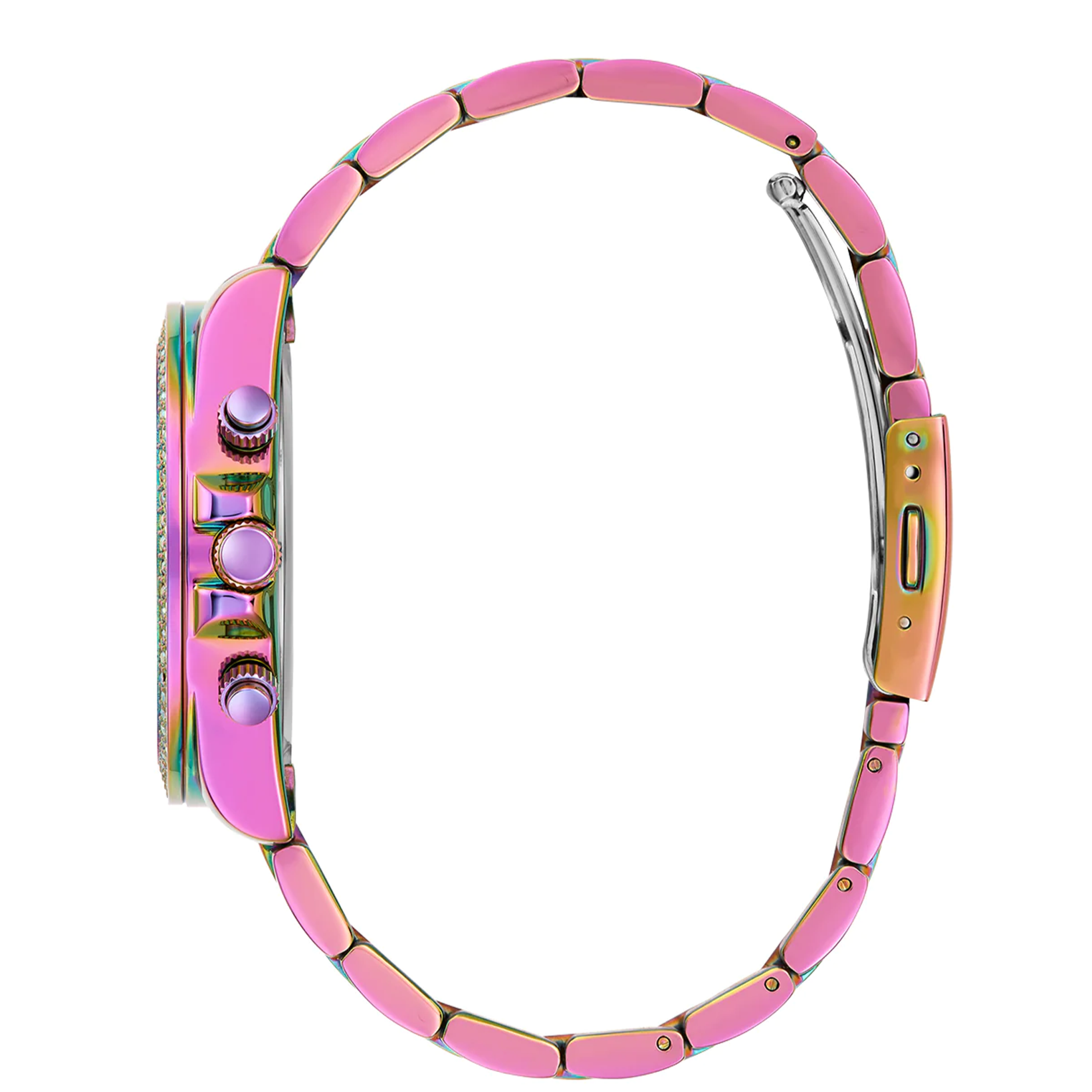 The standout feature of this watch is its polished iridescent case adorned with crystals. The iridescent glitz multifunction dial adds a touch of glamour, making it a true statement piece. Completing the look is the polished iridescent bracelet that adds an extra layer of sophistication.