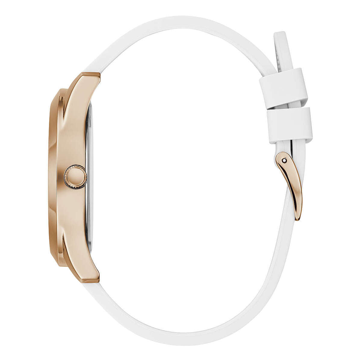 The crush timepiece from Guess features a rose gold plated stainless steel case. The case houses a glistening pink, yellow and orange bubble effect dial. The piece is finished with a contrasting soft white leather strap.