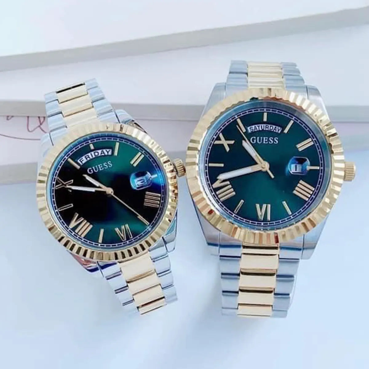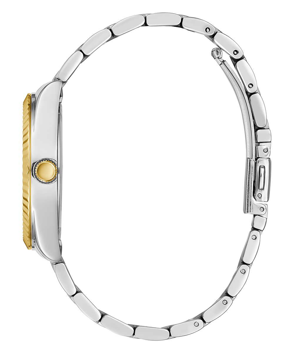 Introducing the Guess GW0308L5 Cosmo watch, a timeless classic that exudes enduring style. This elegant timepiece features a silver stainless steel case complemented by a gold coin edge bezel, offering a sophisticated contrast. The green dial adds a touch of vibrancy, while the polished two-tone gold and silver bracelet enhances its luxurious appeal.