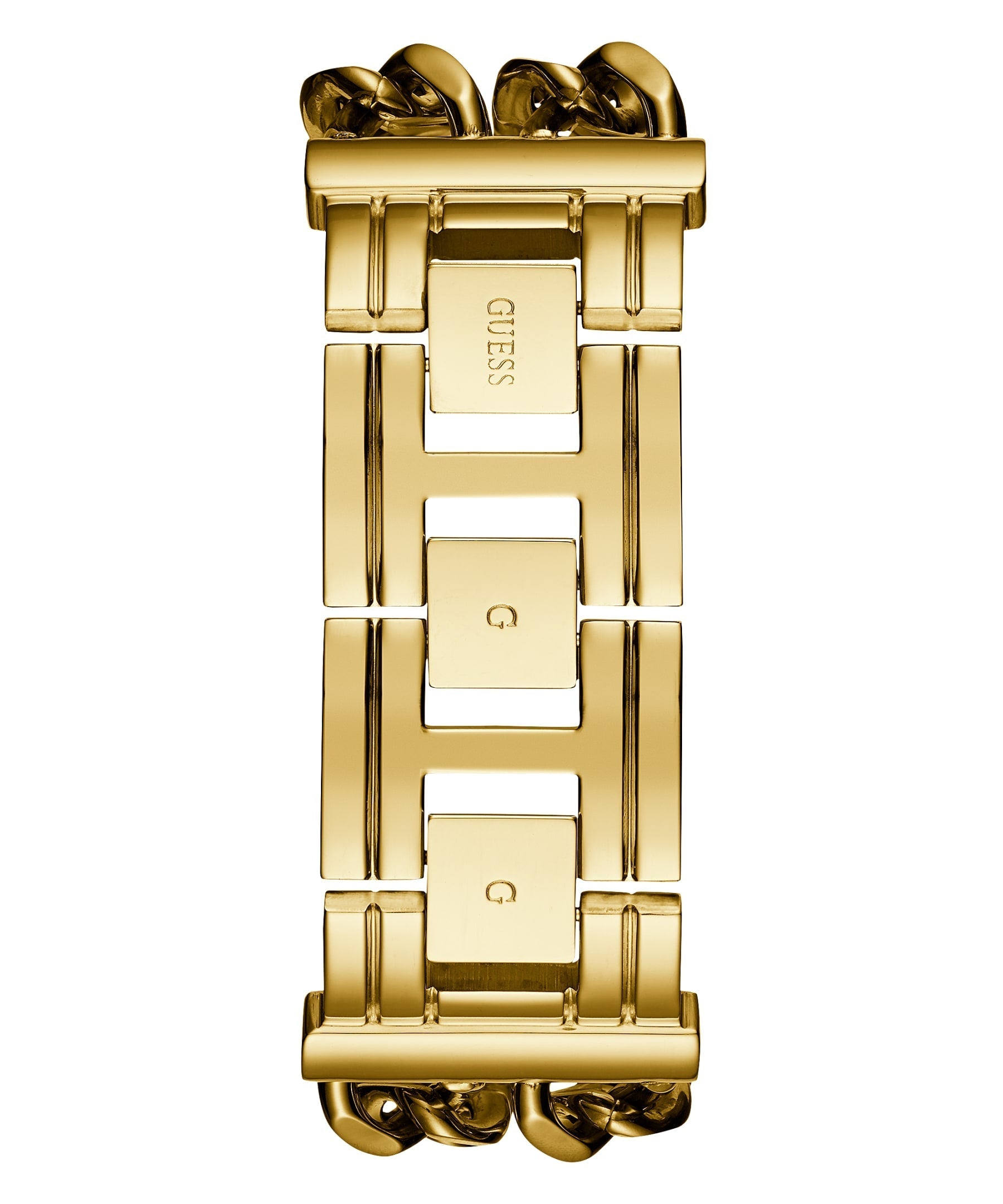 This Guess watch has a gold coated stainless steel case 28mm in diameter and is fitted with a metal Strap . Inside the case lies a movement and the watch features a mineral crystal.The watch is 3ATM. This means the watch is splash waterproof.