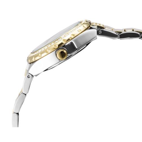 This popular timepiece is from the Viva range by Guess Watches. It comes in a two-tone design, steel and PVD gold plated steel and features a sparkling stone set bezel. This model has a beautiful white dial with elegant sparkling stones, 3 mini dials with day, date, month function and gold Roman n umeral hour markers. It is powered by a quality quartz movement and fastens with a two-tone silver and gold metal bracelet.