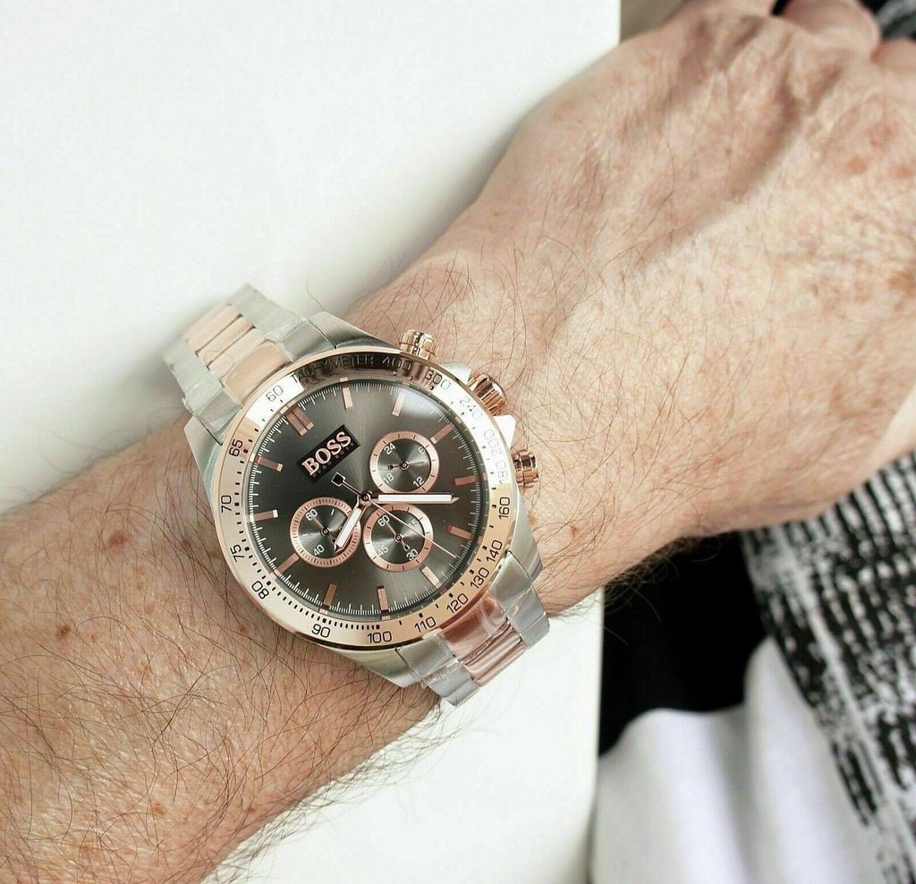 This men’s Hugo Boss HB 1513339 watch is made from rose PVD stainless steel and is powered by a chronograph quartz movement. It is fastened with a silver and rose gold PVD metal bracelet and has a charcoal grey dial.