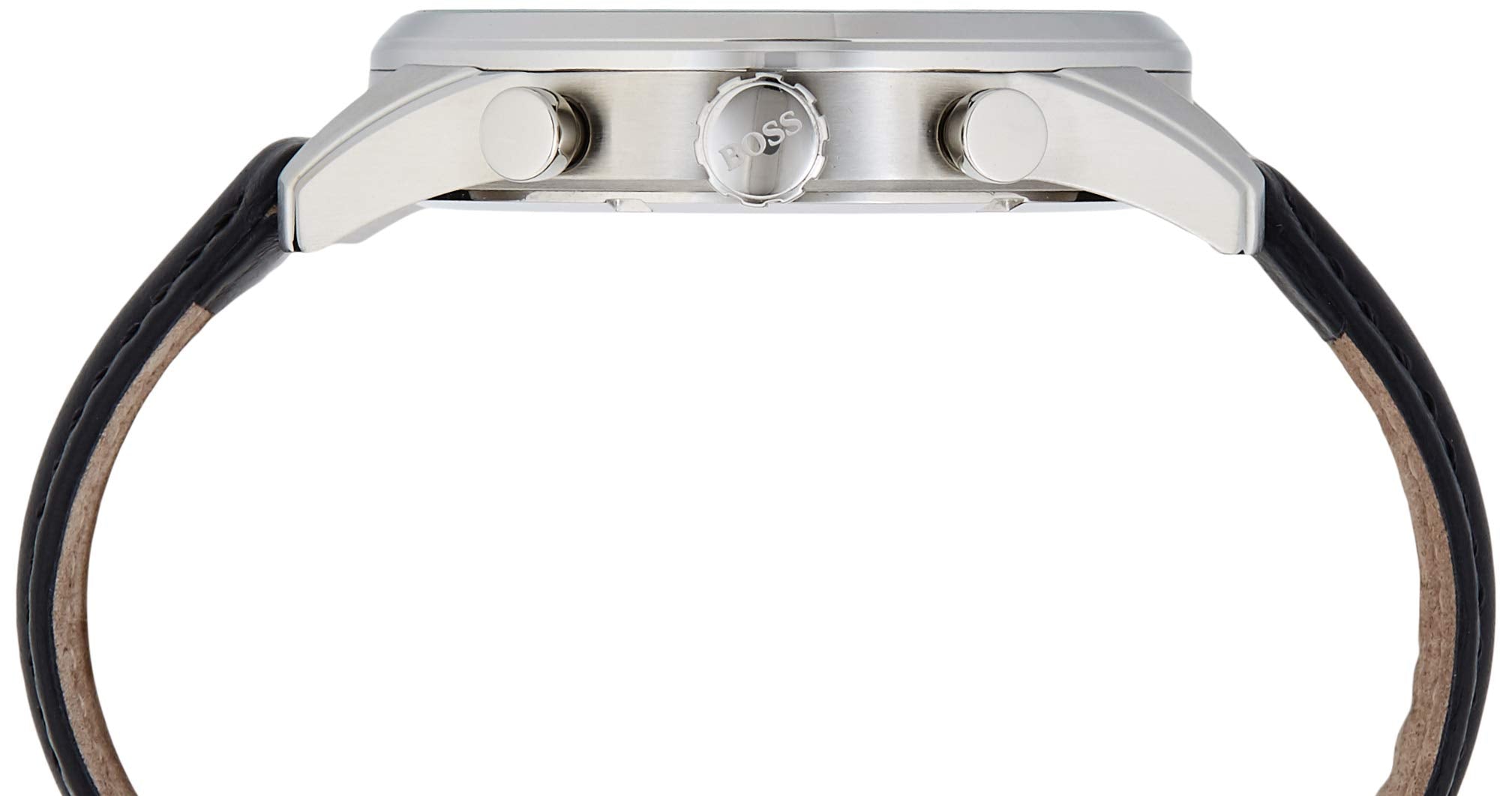 Boss watches are immaculately tailored to lifestyles where style navigates and precision counts. Sharp cuts, clean design and quality materials are always on the agenda. These distinctive timepieces, with their intrinsic air of elegant sophistication, create beautiful bridges connecting classic, modern and sporty. Reliable reminders of individual signatures of ambition and success, they express confidence and refinement in carefully balanced proportions. Stainless steel case with a black leather strap, black dial. Case size 44 mm. Water resistant upto 50 meters. Quartz movement. Mineral crystal. Buckle clasp.