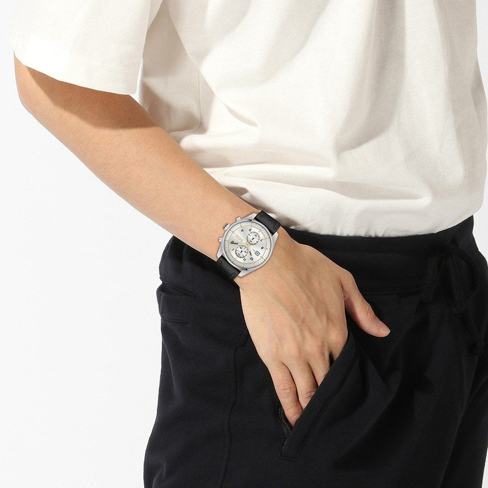 This Hugo Boss watch has a case made of stainless steel with a diameter of 44 mm and is fitted with a leather band. Inside the case lies a Seiko Instruments Inc. movement and the watch features a Mineral crystal.