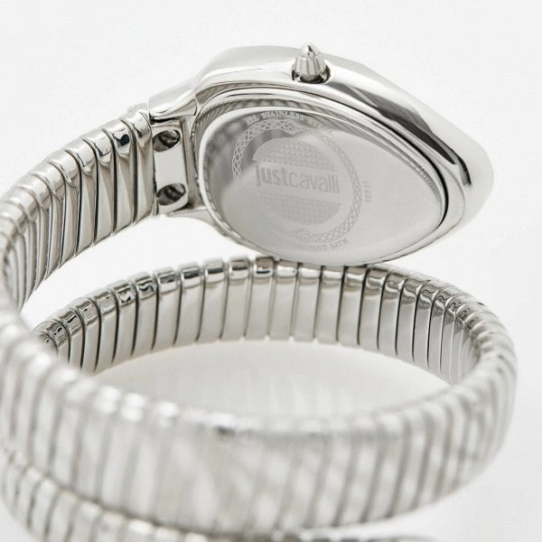 The watch is made of stainless steel. Features include a snake-head-shaped case and a flexible tubular spiral bracelet. The dial is adorned with the company logo and crystals. The crown is cone-shaped.