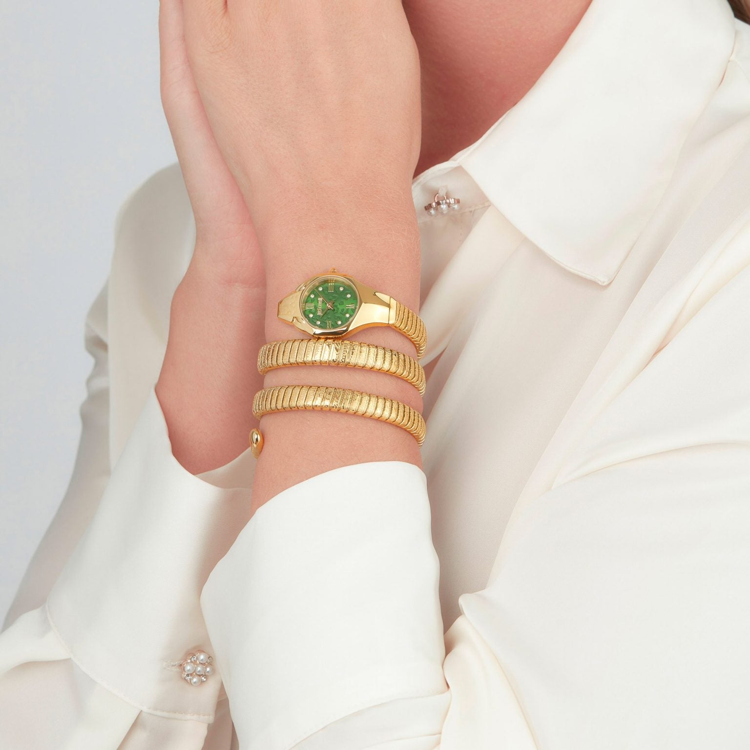 Dazzle with the Just Cavalli Signature Snake Women's Watch, an enchanting blend of Japanese quartz movement and gold-toned glamour. This masterpiece features a round, stainless steel case, an eye-catching green dial, and a coordinating gold bracelet, all impeccably made in Japan. With a mineral crystal cover, 30-meter water resistance, and a chic 22mm case width, this watch beautifully merges style with functionality. Crown your look with this golden accessory that echoes both durability and elegance. JC1L271M0035