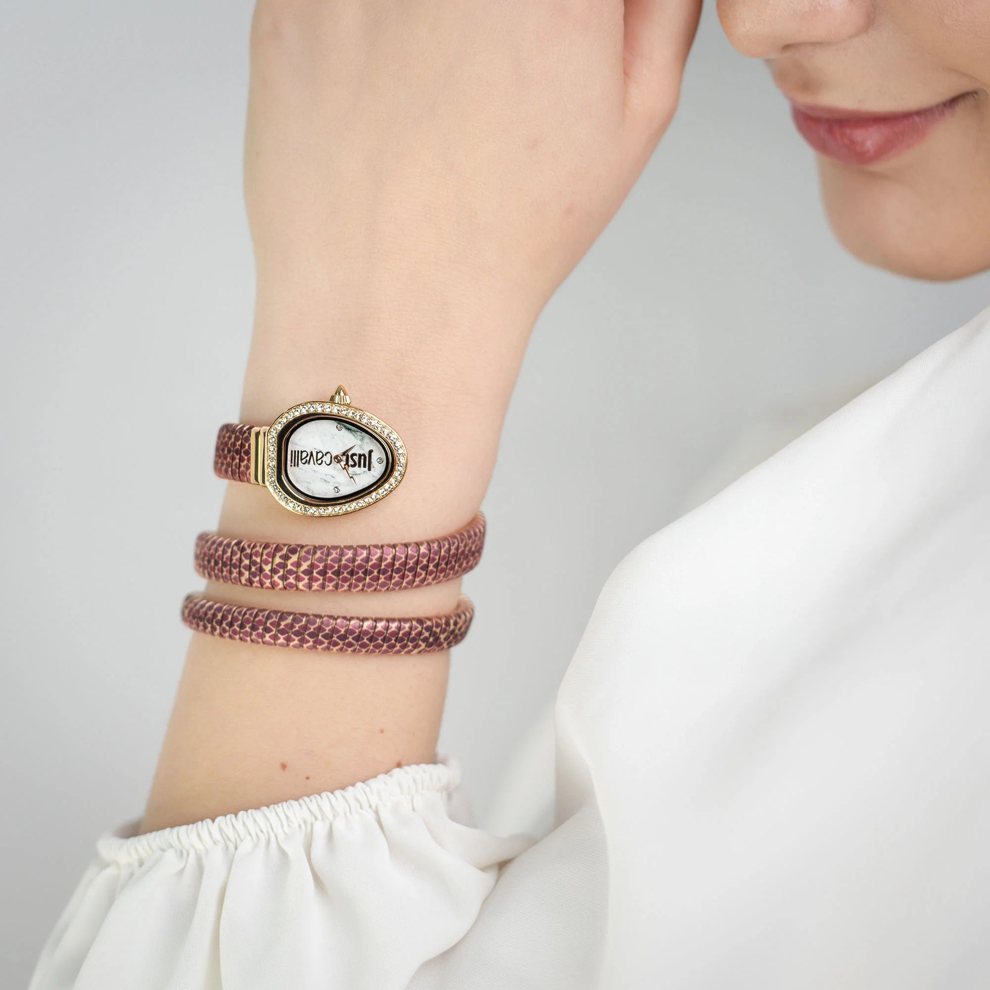 - Silver dial with crystals, 2-hands movement, and Just Cavalli branding logo at 6 o’clock position