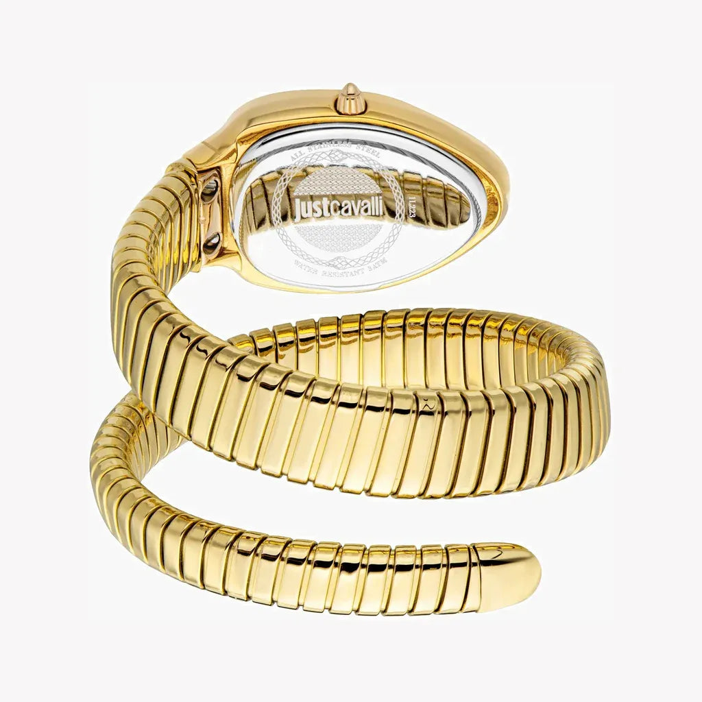 Discover elegance with the Just Cavalli Women's Watch, featuring a stunning gold stainless steel band and an asymmetrical gold case (22 x 33.5 mm). The striking green dial enhances its sophisticated design, making it perfect for any occasion. With a case thickness of 8.5 mm and 3 ATM water resistance, this watch combines style and functionality effortlessly.