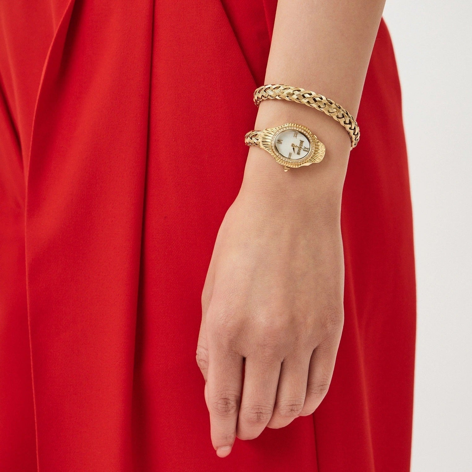 The watch is made of 316L stainless steel. Features include a quartz movement, a dial adorned with crystals and the brand logo, mineral glass, 3 ATM water resistance, a knurled crown, and a snake-shaped bracelet.