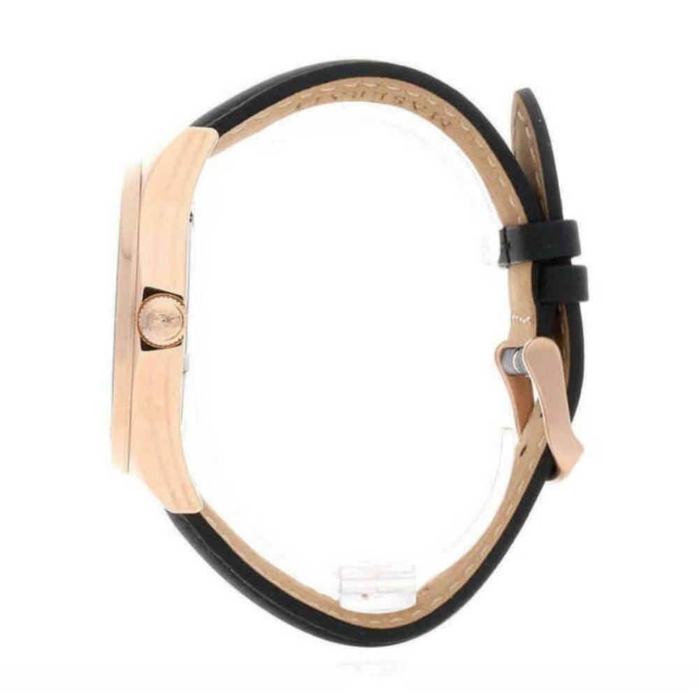 Rose gold PVD stainless steel case with a black leather strap. Fixed rose gold PVD bezel. Black dial with rose gold-tone hands and index hour markers. Minute markers around the outer rim. Dial Type: Analog. Luminescent markers. Date display at the 3 o'clock position. Caliber VJ42 quartz movement.
