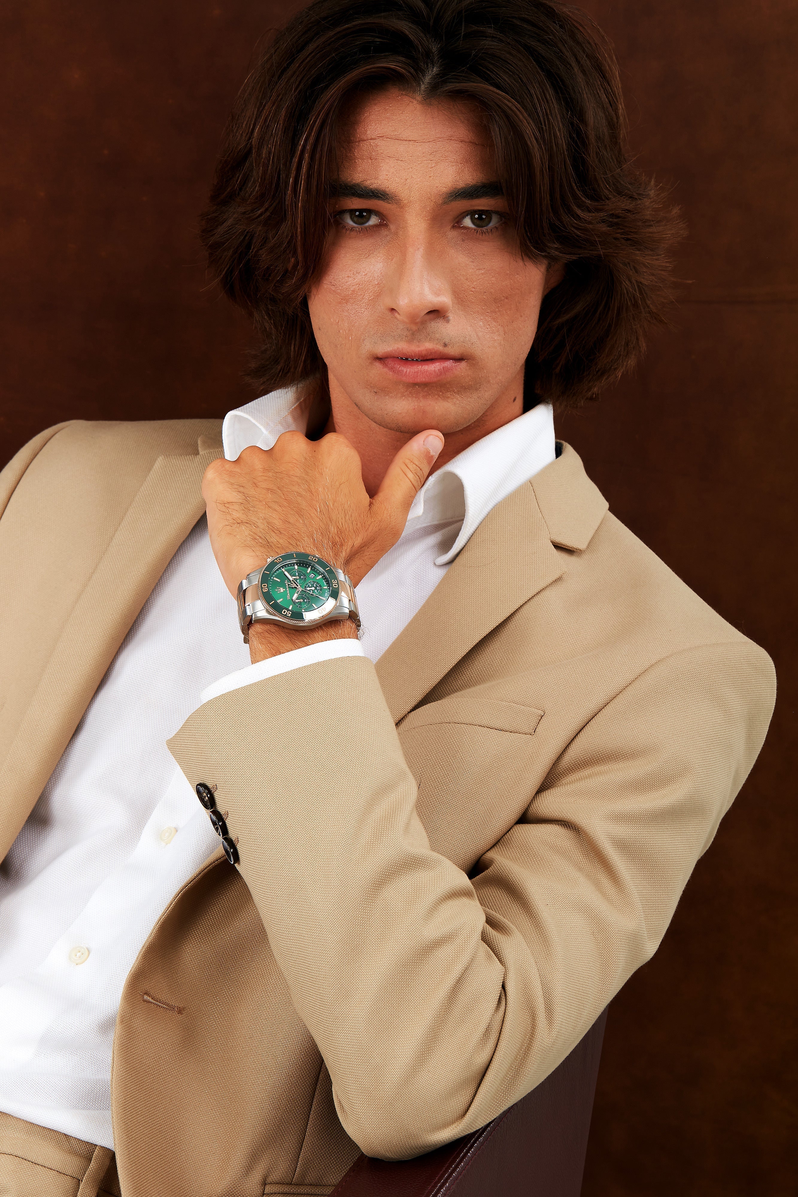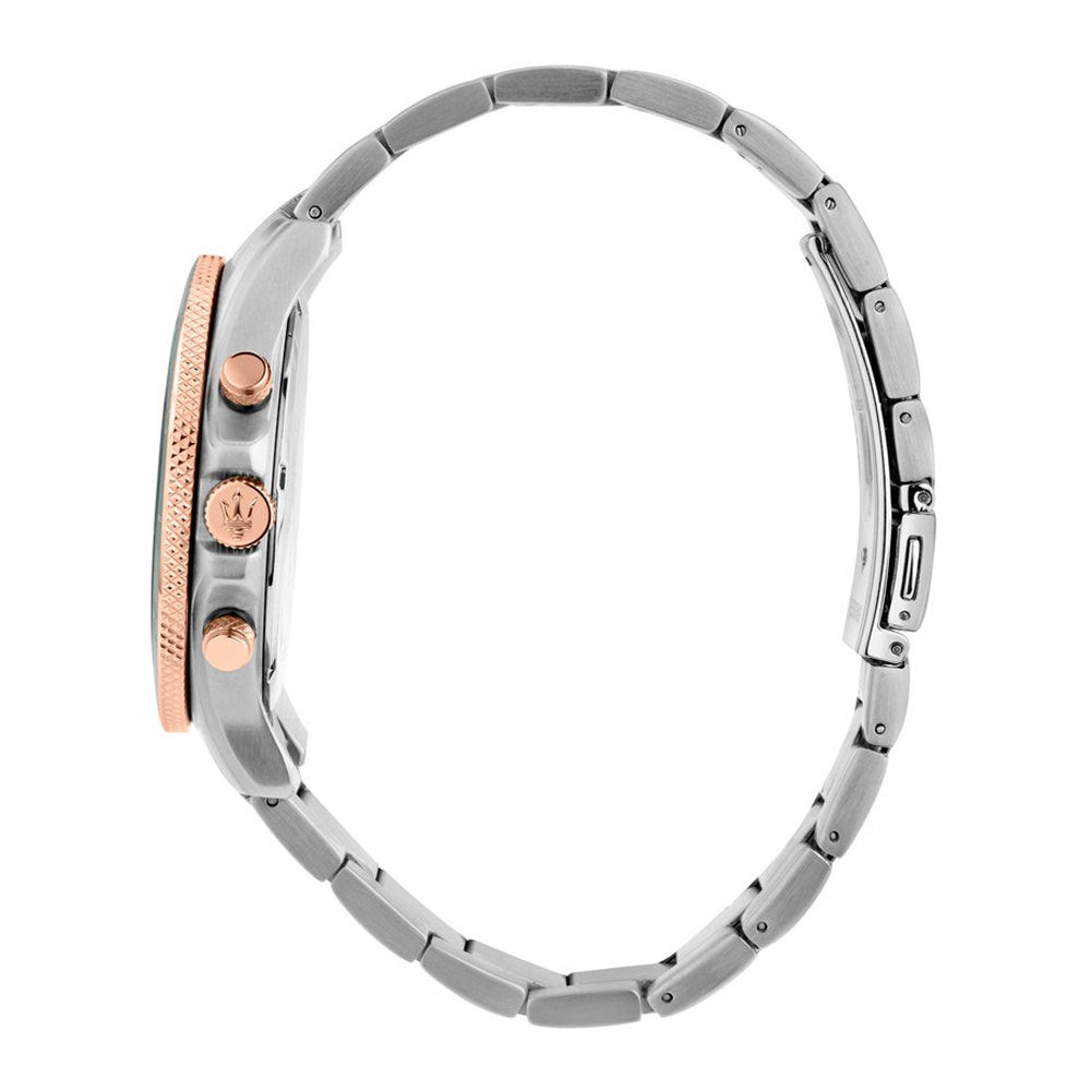 MASERATI men's watch from the COMPETIZIONE collection. Watch with MVT.MIYOTA JS25 movement, chronograph function. Dial: Chronograph indexes with date display at 4.5 o'clock, polished and satin finish, GREEN colour. SUNRAY. Band Type: Semi-Solid. Strap material: Rose Gold colored metal bracelet. Steel.