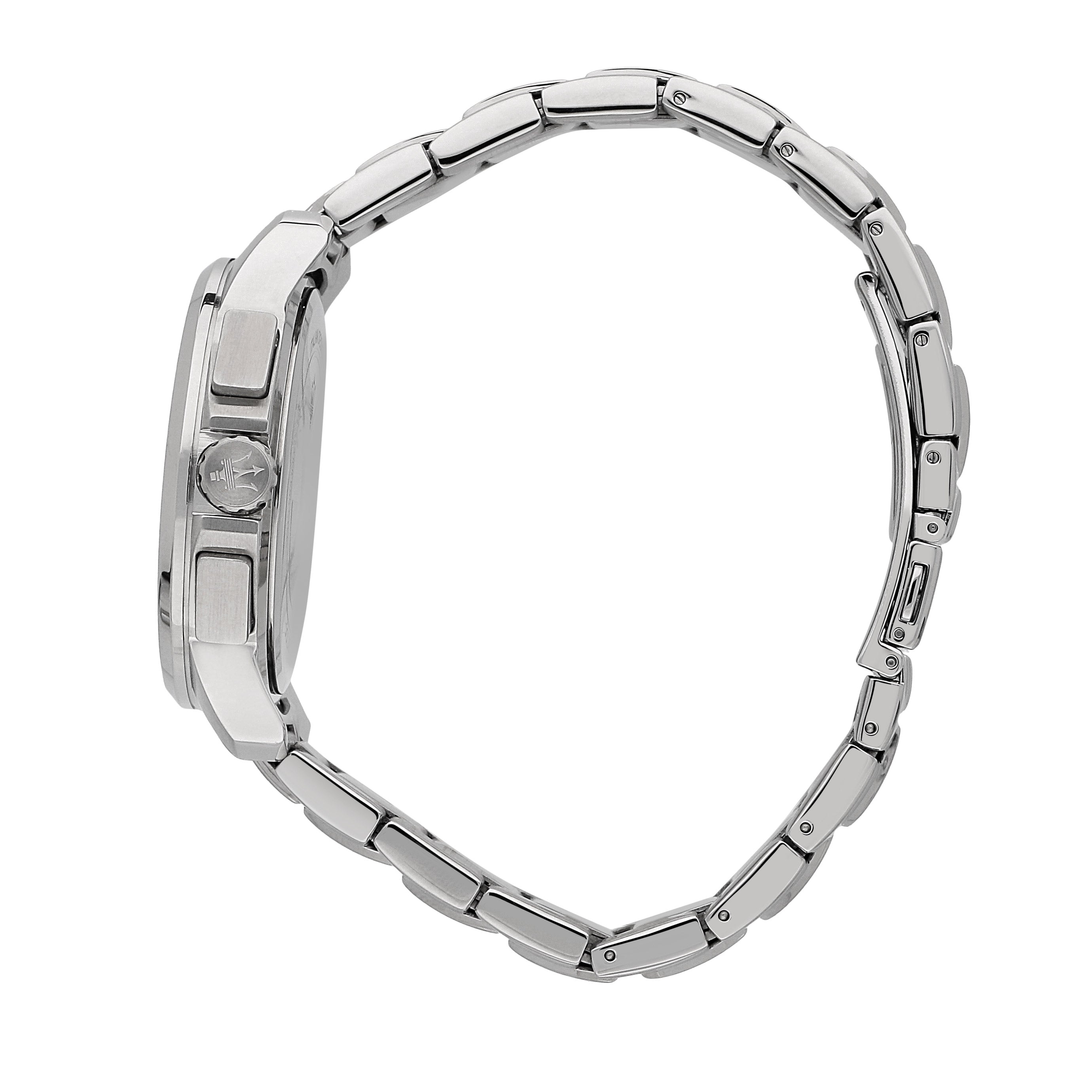 Maserati Successo Watches - Solar - Case Material & Finish: Stainless Steel, Case width: 44mm, Strap Material: Metal , Strap Colour: Silver, Dial Colour: Blue, Sunray, Water resistant: 5ATM, Crystal: Mineral crystal, Material: Stainless Steel, Case thickness: 11.70, Gender: Male, Buckle: Box buckle with pushers, Guarantee: Maserati 2 years guarantee, Packaging: Maserati original packaging