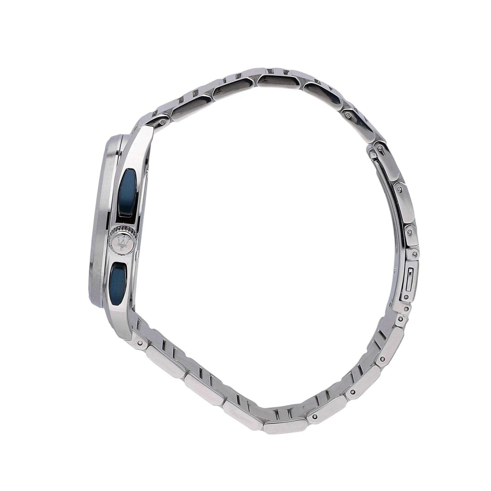 Men's Maserati watch R8873632004, with MVT VR32 DATE 4,5H,AIG1 WHIT B/G BLK NUM movement from Trimarano Collection, has a stainless steel strap and a round stainless steel case that measures 41 mm, equipped with a mineral crystal. Water Resistant 100 m (330 ft). The watch comes in its Maserati original box, that also contains the warranty and the user's manual.