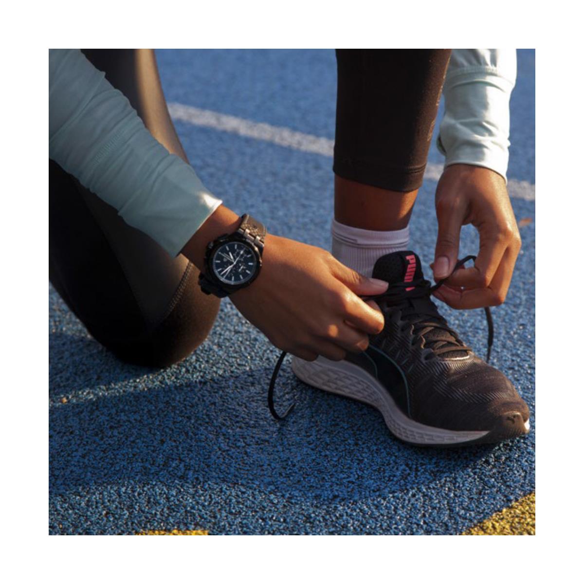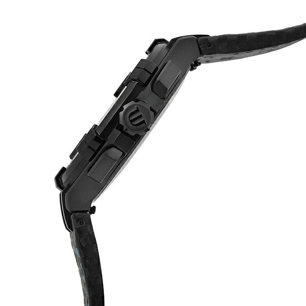 The black carbon-effect leather strap is one of many attractive features of this timepiece that embrace are reflective of the watch’s sporty nature. Perhaps inspired by today’s automotive and motor sport technology, as it already involve high-tech ceramics and carbon fibre composites. Nonetheless, the bracelet only bares a similar weave like appearance, as it is made from stitched leather. The contrasting blue stitching that runs around the outer edge of the strap distinguishes it. So, not only will this watch leather strap add glamour to your wrist, but it also feel comfortable too. Also, it fastens easily using a stainless steel butterfly clasp.