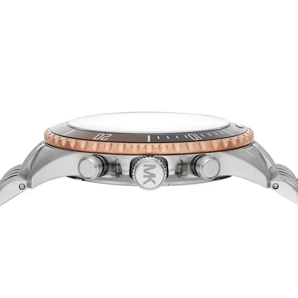 Michael Kors Men's Bayville 44x50mm watch features a black sunray dial with silver-tone stick indexes and numerals, chronograph movement and Steel bracelet.