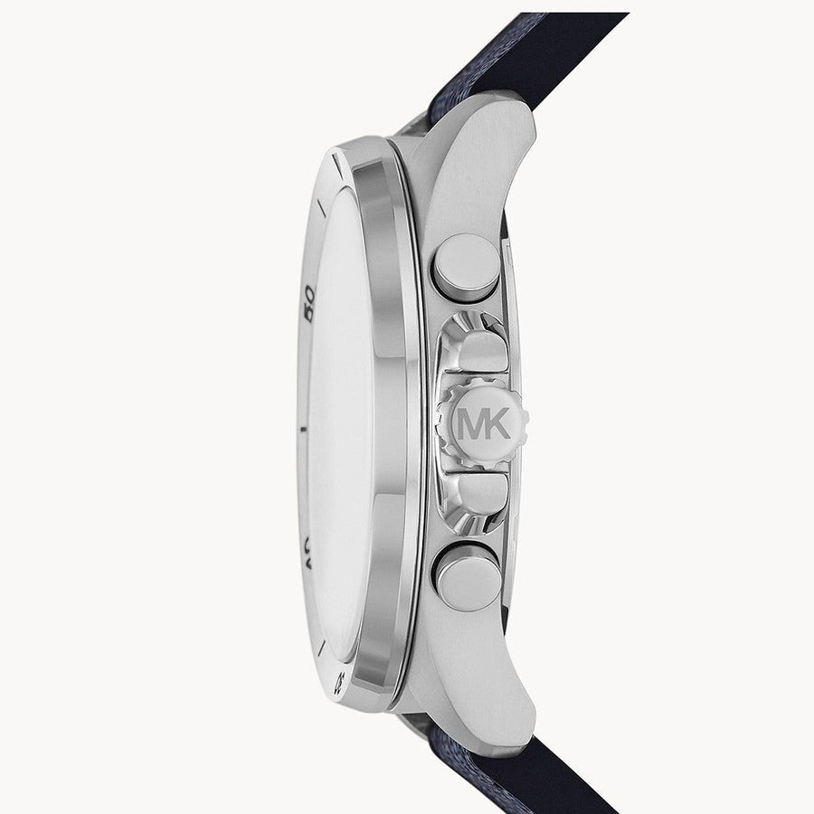 Michael Kors' 45mm Brecken watch features a navy dial with black sub-eyes, silver-tone case, chronograph movement and black silicone strap with navy PVC leather logo inlay.