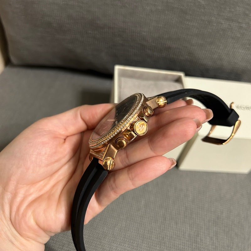 Rose gold-tone stainless steel case with a black rubber strap. Fixed- crystal set bezel. Black dial with rose gold-tone hands and index-Arabic at the 12 o' clock hour markers. Dial Type: Analog. Date display at the 6 o'clock position. Chronograph - three sub-dials displaying: 60 second, 30 minute and 24 hours.
