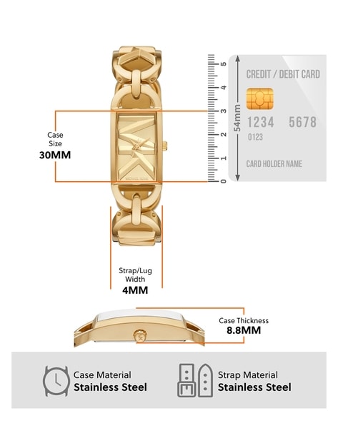 Michael Kors Watch women's watch, from the Mk Empire collection. Watch with 3-sphere quartz movement, made of stainless steel with rectangular-shaped case with a glossy gold-colored finish. The dial is gold in colour. Case diameter: 30mm. Case thickness: 8mm. Lug distance: 4 mm. The bracelet is made of stainless steel, with a polished finish. Strap colour: gold. Band type: chain. Closure: bracelet with removable links. The water resistance is 5 atm. The reference is: MK7406.
