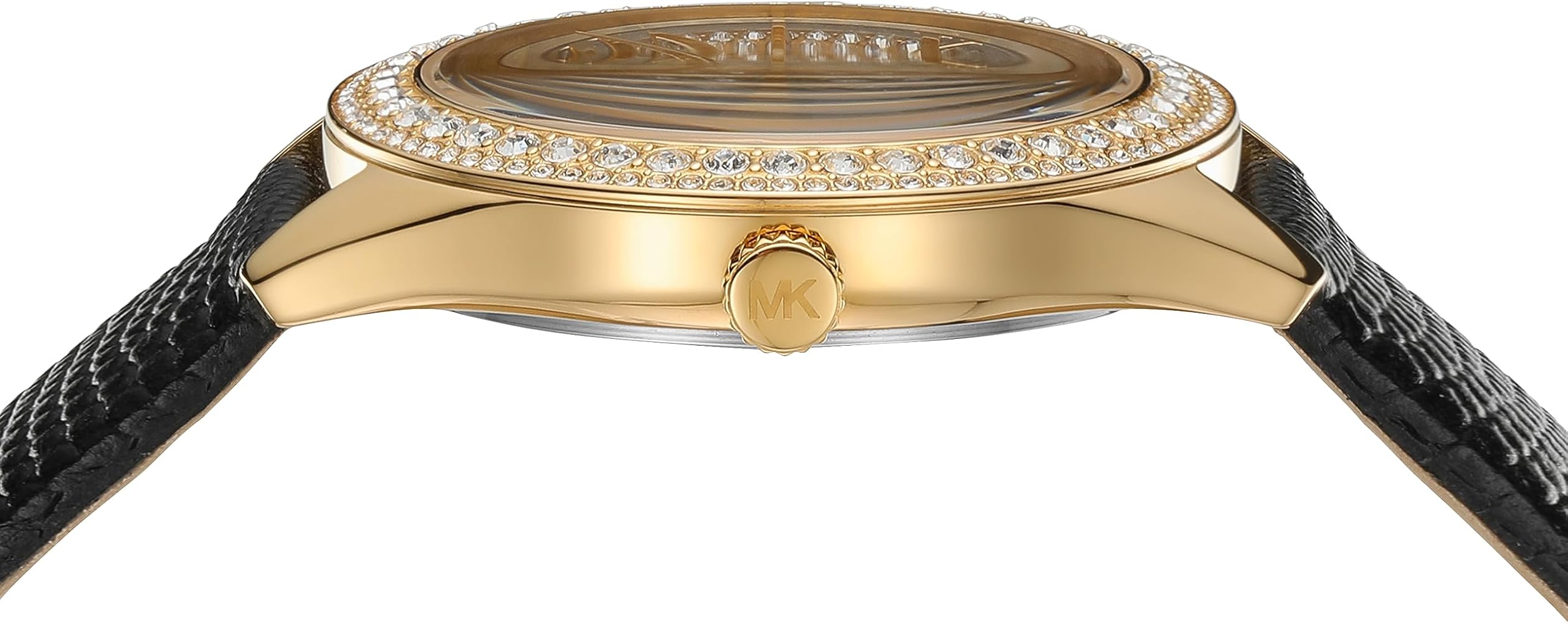 Add a tinge of subtlety to your look with this women's analog watch from Michael Kors. The gold round dial is protected by a mineral glass. Michael Kors' 38mm Harlowe watch features a gold-tone pave textured dial, pave topring, three-hand movement and black lizard strap. Besides, it is completed with a buckle clasp to ensure a secure fit on the wrist.