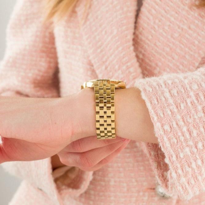Introducing, Harlowe. This new feminine pretty platform has all the details of luxury she'll love. This gold-tone stainless steel watch features a dial with outer rows of pave and classic Roman Numerals. The pave extends onto the topring in multiple rows with different sized stones for an effortlessly elegant look.