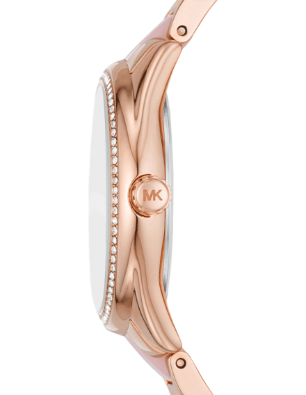 Add the perfect finishing touch to your look with this women's analog watch from Michael Kors. The rose gold round dial is protected by a mineral glass. Michael Kors' 36mm Mini Janelle watch features a rose gold pave sunray dial, three-hand movement and two-tone stainless steel bracelet with blush centerlinks
