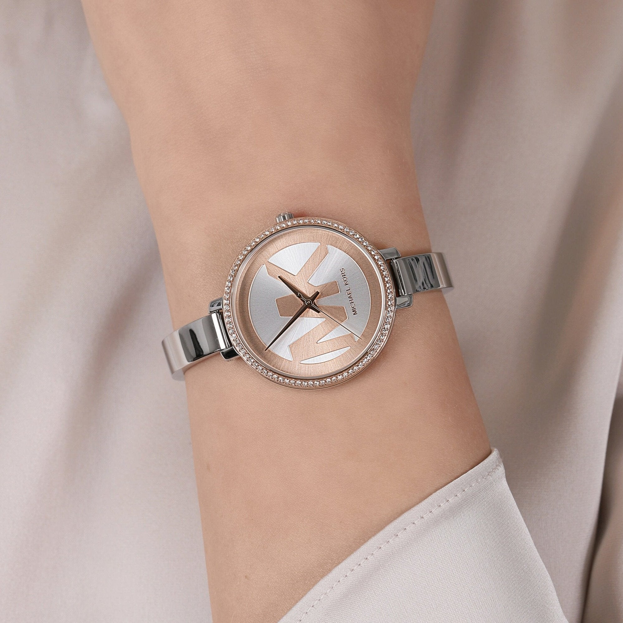 Bangle type "JARYN" that can be worn like jewelry. The contrast of the thin bracelet with a Bollac acetate embedded and the dial with the brand logo MK is dropped on to create a dainty arm.