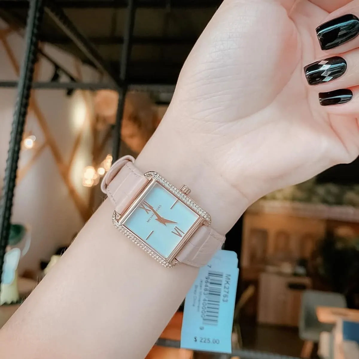 A decidely sophisticated take on a classic design, the stylish Lake shines with a rose-gold stainless-steel rectangle case with a glitz topring, white sunray dial, rose-gold dash markings at 3/9 hours and pink leather strap. The reliability and class of Michael Kors makes it a must have for all fashion aficionados.