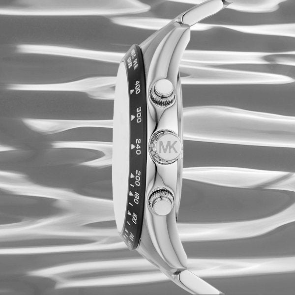 Quartz movement. Scratch resistant mineral crystal. Pull / push crown. Solid case back. Round case shape. Case size: 45 mm. Case thickness: 10 mm. Band width: 22 mm. Fold over clasp with a push button release. Water resistant at 50 meters / 165 feet. Functions: chronograph, tachymeter, date, hour, minute, second. Layton Series. Casual watch style. Michael Kors Layton Chronograph Quartz Green Dial Men's Watch MK8912.