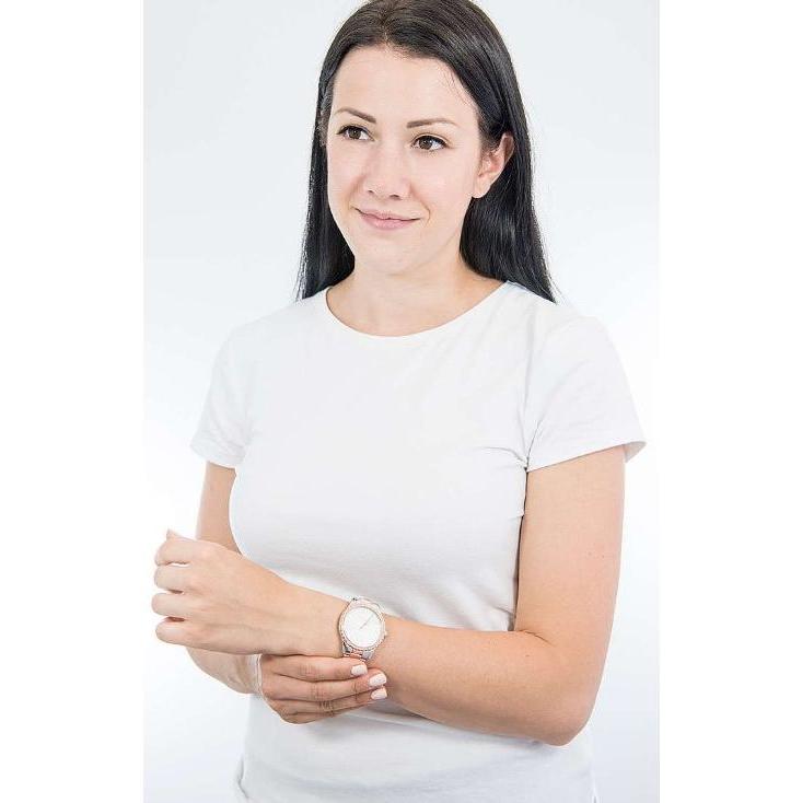 Michael Kors MK6849 steel women's time-only watch. Watch with a 38 mm diameter and 8 mm thick steel case. Polished rose gold-colored stainless steel bezel embellished with crystals. White mother-of-pearl dial with mineral glass. Quartz time-only movement. Silver-colored steel bracelet with rose details, Deployant clasp and 18 mm lug distance. Watch waterproof up to 5 atm, delivered with original box and official guarantee.
