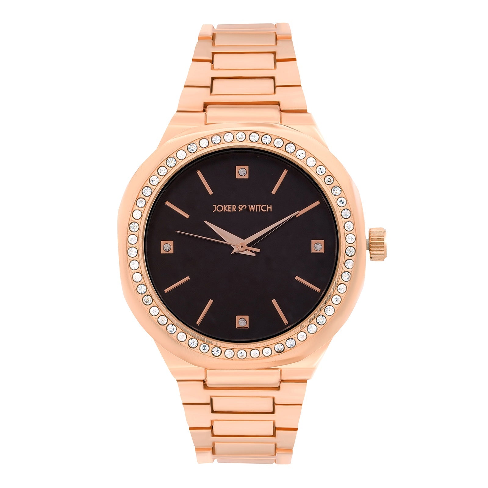 The 1.5 inch (37 mm) diameter rose gold tone LENNOX gives you a level of style. The unique faceted pave top ring and black dial stand out, and the subtle glamour makes this watch perfect for everyday wear.