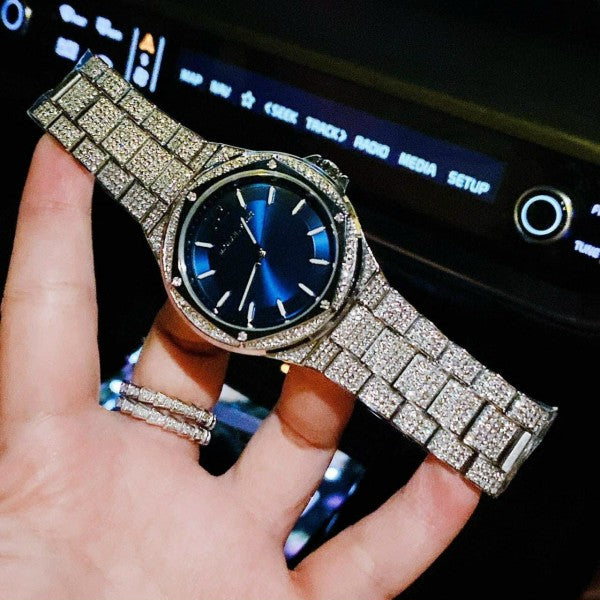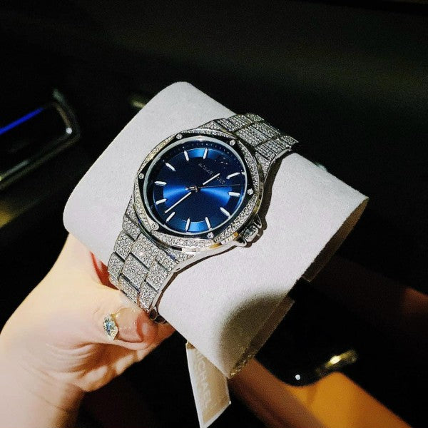 Michael Kors' 41mm Lennox watch features a navy sunray dial with white indexes, silver-tone pavé case with a faceted pavé topring, three-hand movement and all-over pavé stainless steel bracelet.