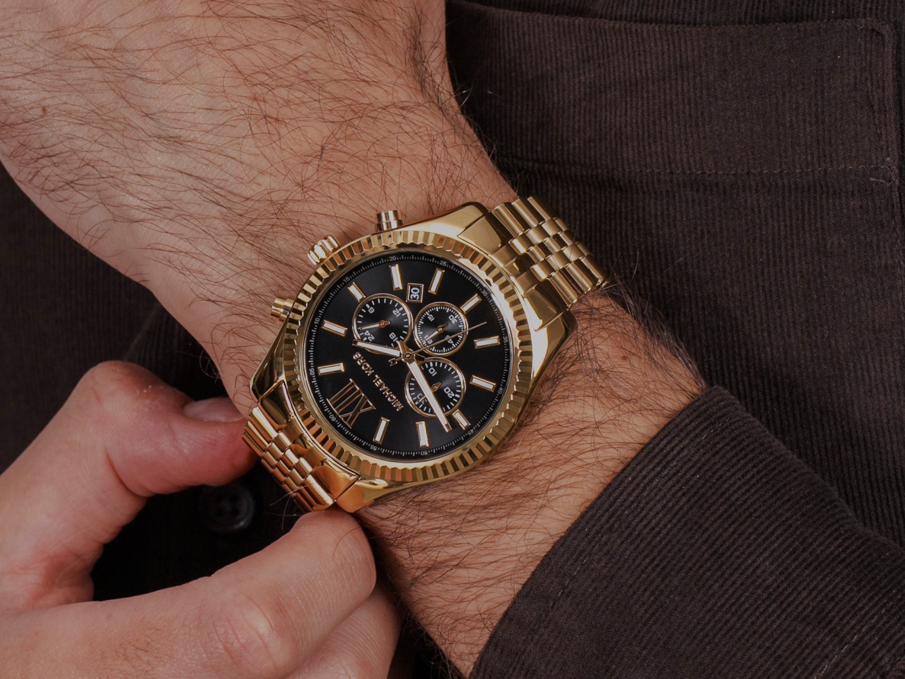 Magnificent mastery of style is yours when you wear this illustrious Michael Kors timepiece. Gold-tone stainless steel case and bracelet. Fold-over clasp closure with push-button release. Three-hand analog display with quartz movement, three sub-dials and date display window. Chronograph functionality. Dial face includes stick and Roman numeral hour markers along with brand name. Dial ring features split-second track. Beveled top ring. Water resistant 10 ATM/100 meters.