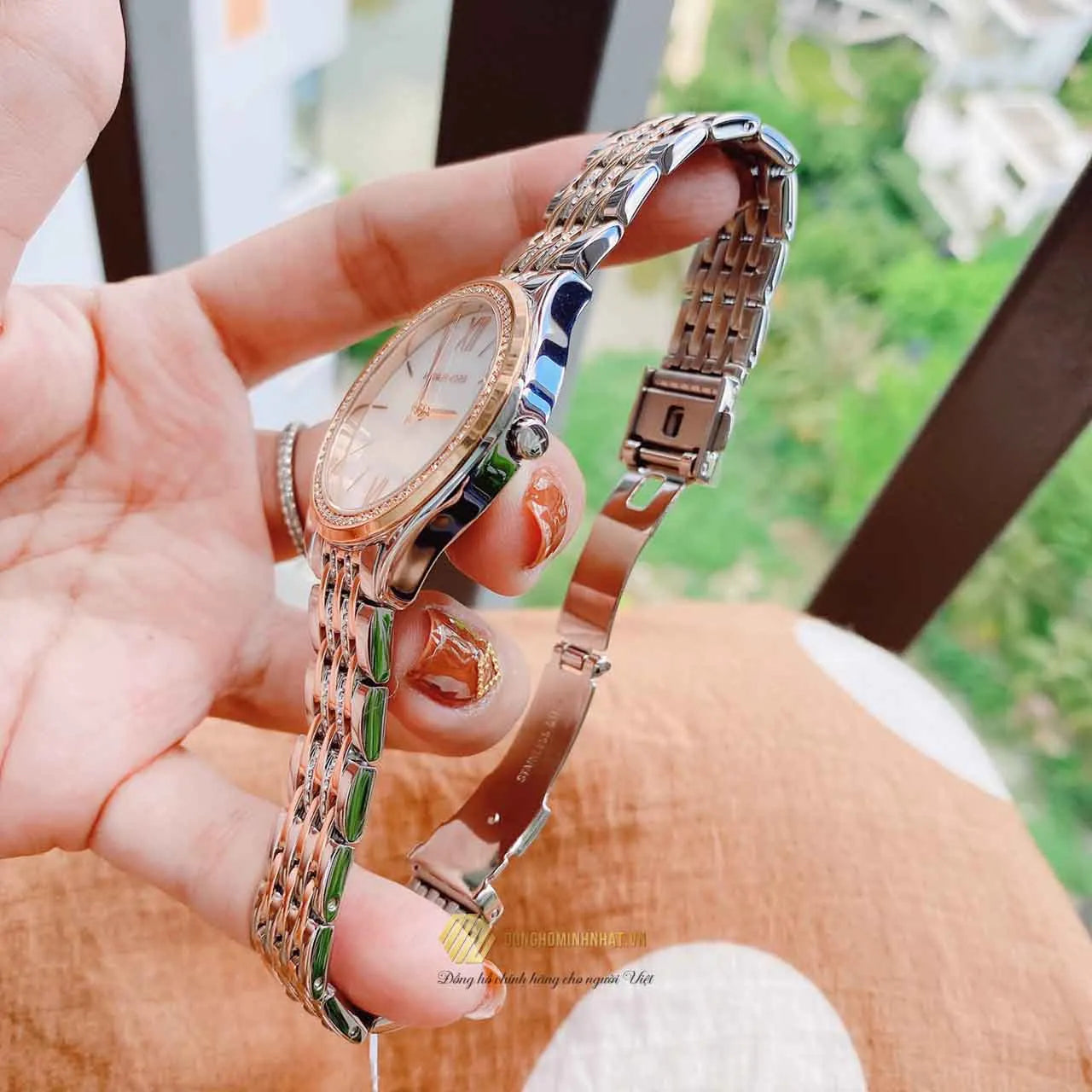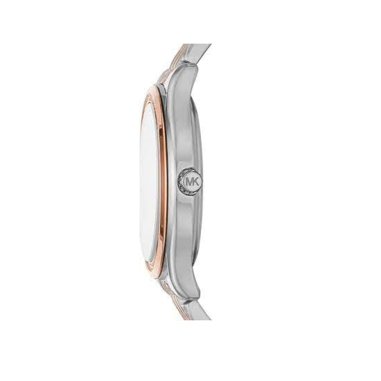 Michael Kors' Mindy 36mm watch features a white mother-of-pearl dial with rose gold-tone stick and Roman numeral indexes, three-hand movement and Steel bracelet with glitz-covered and rose gold-tone center links.