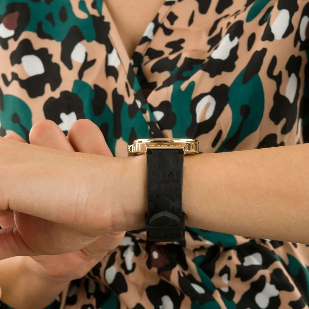 Embrace timeless elegance with the Michael Kors Mini-Lennox (MK7281), a captivating blend of modern design and classic charm. This exquisite watch features a 37mm gold-tone stainless steel case that seamlessly complements the comfortable black silicone strap, creating a perfect fusion of sophistication and functionality.