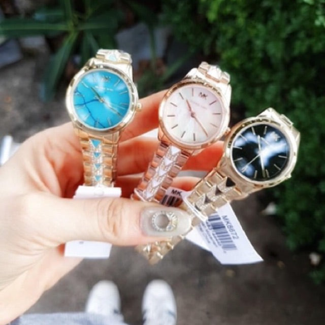 Truly unique, MK's iconic Runway watch is designed in a lustrous gold-tone finish with a brilliant blue marble dial. Whether you slip it on solo or with a chic stack of bangles, the result is timeless. This 38mm watch features a blue dial in a stainless steel case with three hand movement and a textured, crystal encrusted, gold and blue stainless steel strap.