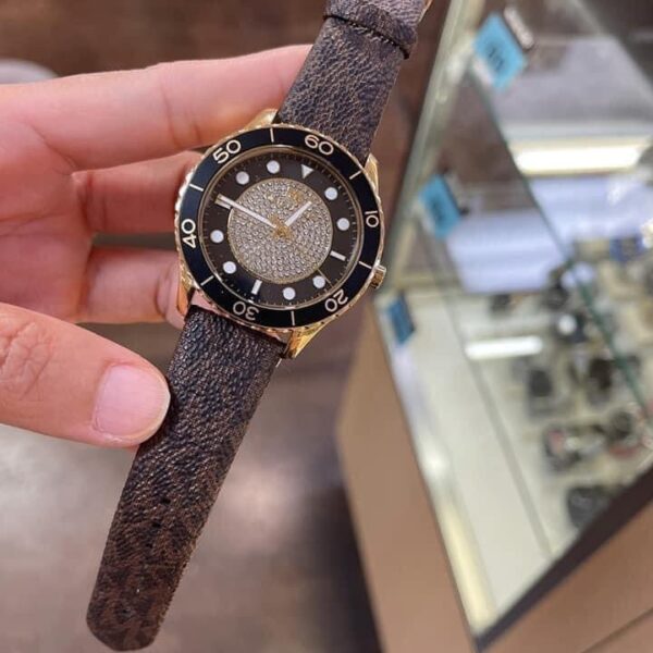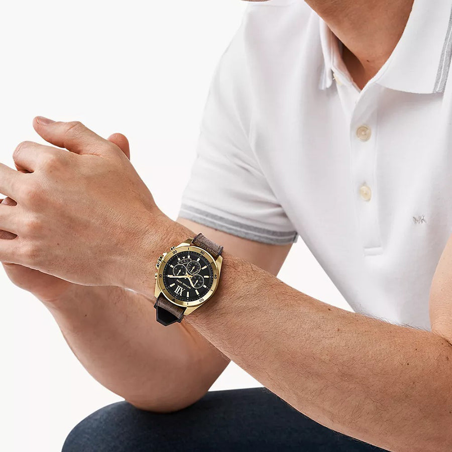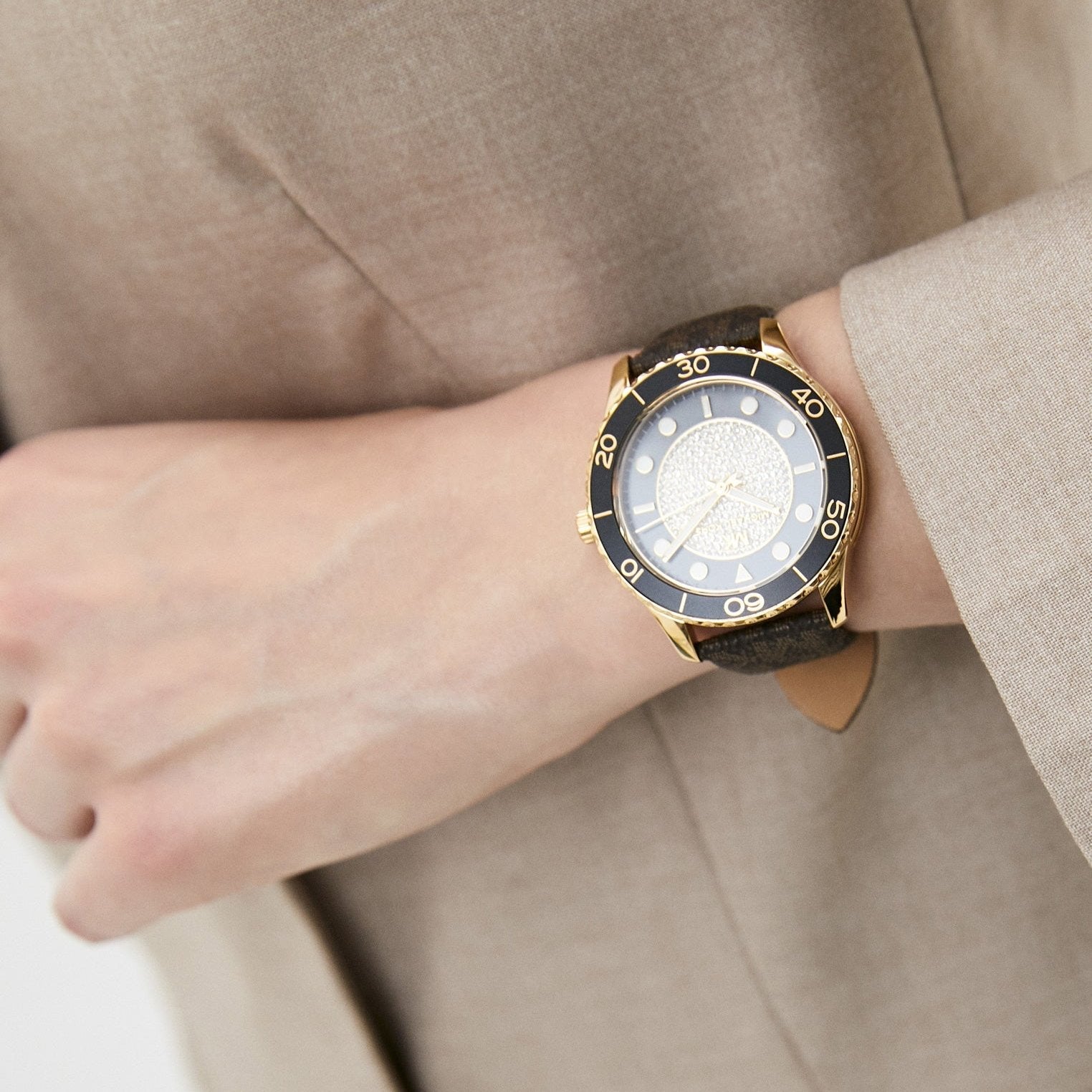 Michael Kors' 40mm Runway watch features a black dial with pavé center, gold-tone case with black aluminum sport topring, three-hand movement and brown logo-printed pvc strap.