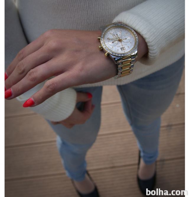 Gold-tone stainless steel case with a two-tone (silver and yellow gold-tone) stainless steel bracelet. Fixed yellow gold-tone bezel set with crystals. Silver dial with luminous yellow gold-tone hands and crystal hour markers. Minute markers. Tachymeter around the outer rim. Dial Type: Analog. Luminescent hands and markers. Date display below the 12 o'clock position.