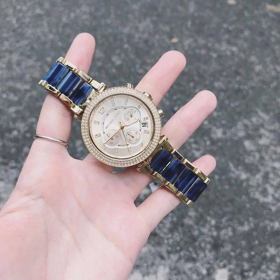 Scratch resistant mineral crystal. Pull / push crown. Solid case back. Case diameter: 39 mm. Case thickness: 11 mm. Round case shape. Band width: 12 mm. Band length: 8 inches. Folding clasp with push button release. Water resistant at 100 meters / 330 feet. Functions: date, day, hour, minute, second, 24 hour. Casual watch style. Michael Kors Parker Multi-Function Champagne Dial Gold-plated and Blue Tortoise-shell Acetate Ladies Watch MK6238