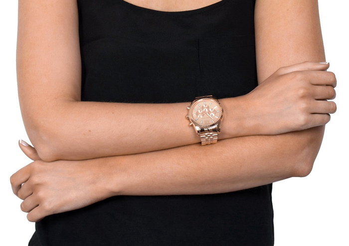 A stunning textural topring adds eye-catching appeal to the rose gold-tone stainless steel Michael Kors MK8319 Lexington chronograph watch. It features a rose gold-tone dial with luminous hands and index hour markers, fixed bezel and a rose gold-plated stainless steel case and bracelet. Quartz movement with analog display. Chronograph - three sub-dials. Scratch-resistant mineral crystal. Solid case back. Men's Lexington Rose Gold Stainless Steel Chronograph Micheal Kors Watch MK8319 Rose Gold-Tone Dial Rose Gold-Plated Stainless Steel Three Sub-Dial Scratch Resistant