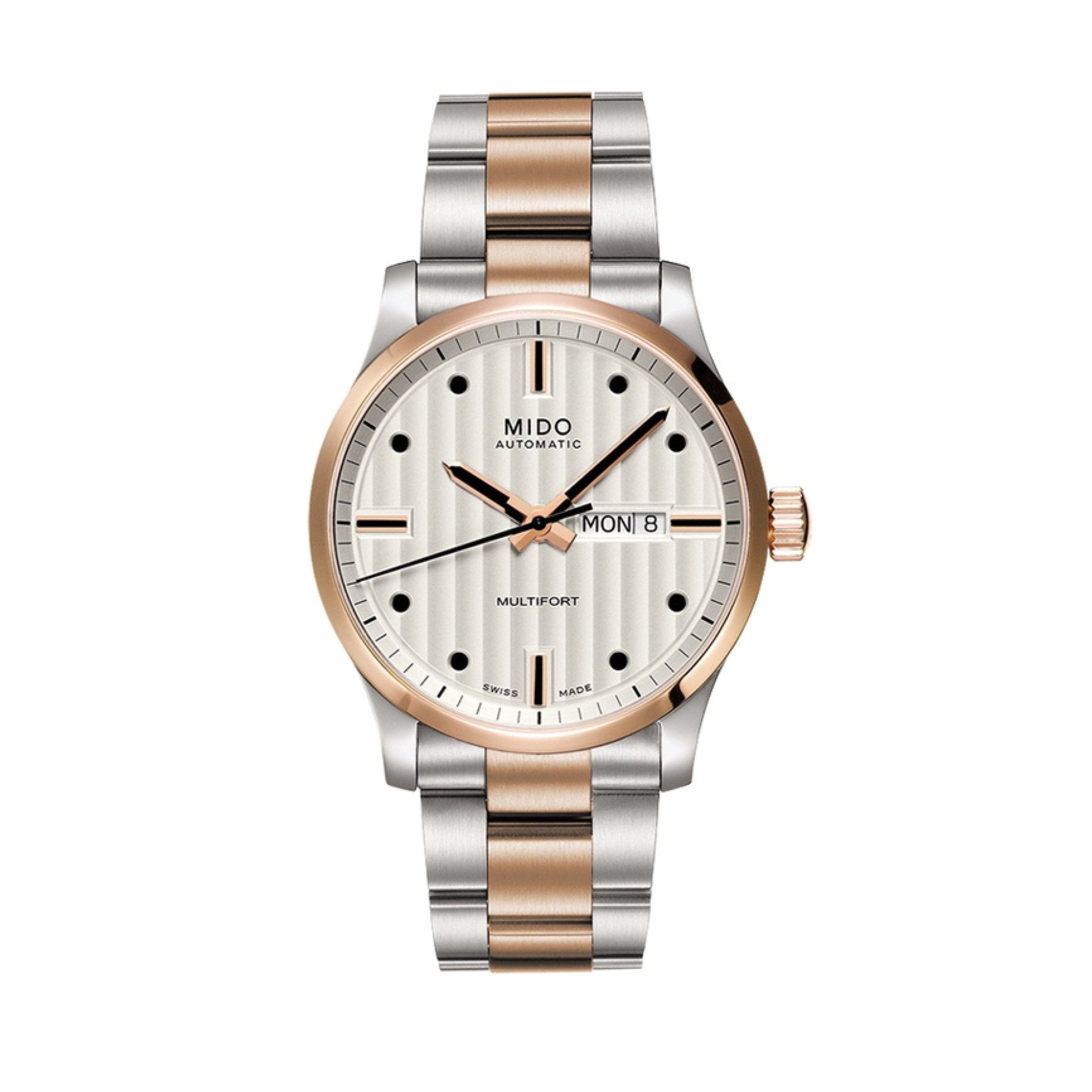 Silver-tone stainless steel case with a two-tone (silver-tone and yellow gold PVD) stainless steel bracelet. Fixed yellow gold PVD stainless steel bezel. Silver dial with yellow gold-tone hands and dot hour markers. Minute markers around the outer rim. Dial Type: Analog. Day of the week and date display at the 3 o'clock position. Mido Calibre Powermatic 80 (ETA C07.621) Automatic movement, based upon ETA 2824-2, containing 23 Jewels, bitting at 21600 vph, and has a power reserve of approximately 80 hours. Scratch resistant sapphire crystal.